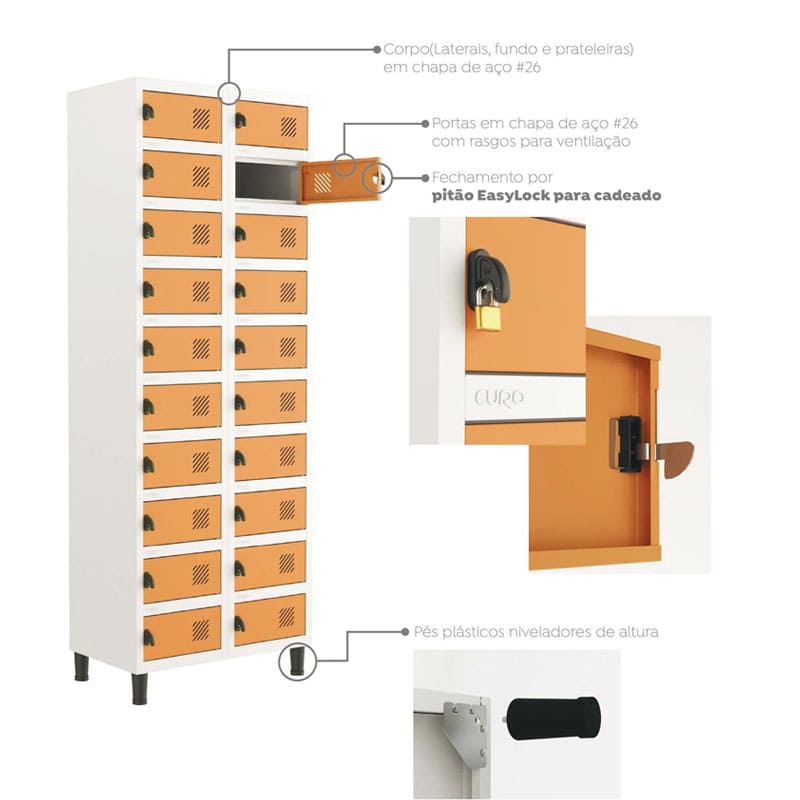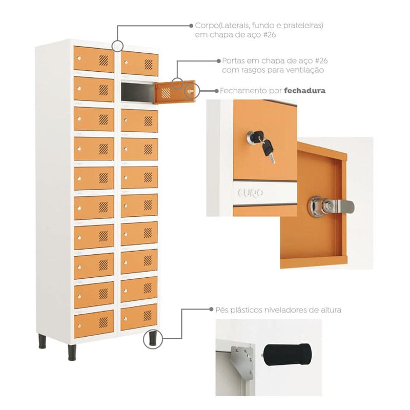 Pensando na durabilidade do Armário guarda volumes para celular tem garantia de qualidade, as fechaduras desse guarda volume são encarenadas, o que garante que as mãos não tenham contato com o aço, assim evitando o enferrujamento do mesmo.